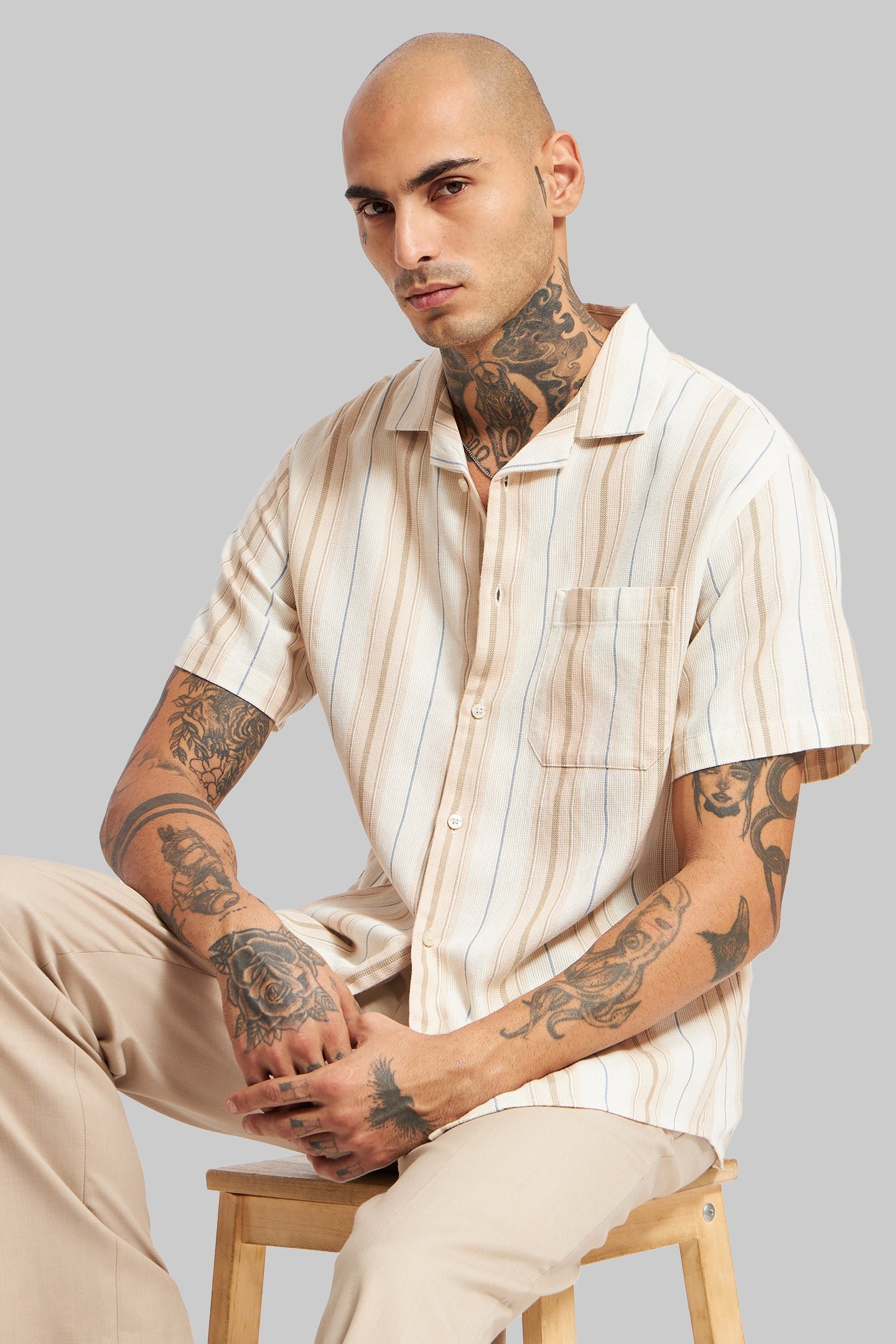 Introducing our beige pink Stripe Half Sleeves Shirt for Men, a must-have essential for your wardrobe. Tailored from premium cotton fabric, this shirt offers a relaxed fit that ensures breathability and ease of movement. The camp collar design adds a modern touch, making it a standout piece for casual settings. The gentle beige stripes lend a subtle yet stylish appeal, perfect for those who appreciate understated elegance. Whether you’re lounging at a caf? or exploring the city, this shirt promises versatility and comfort without compromising on style.