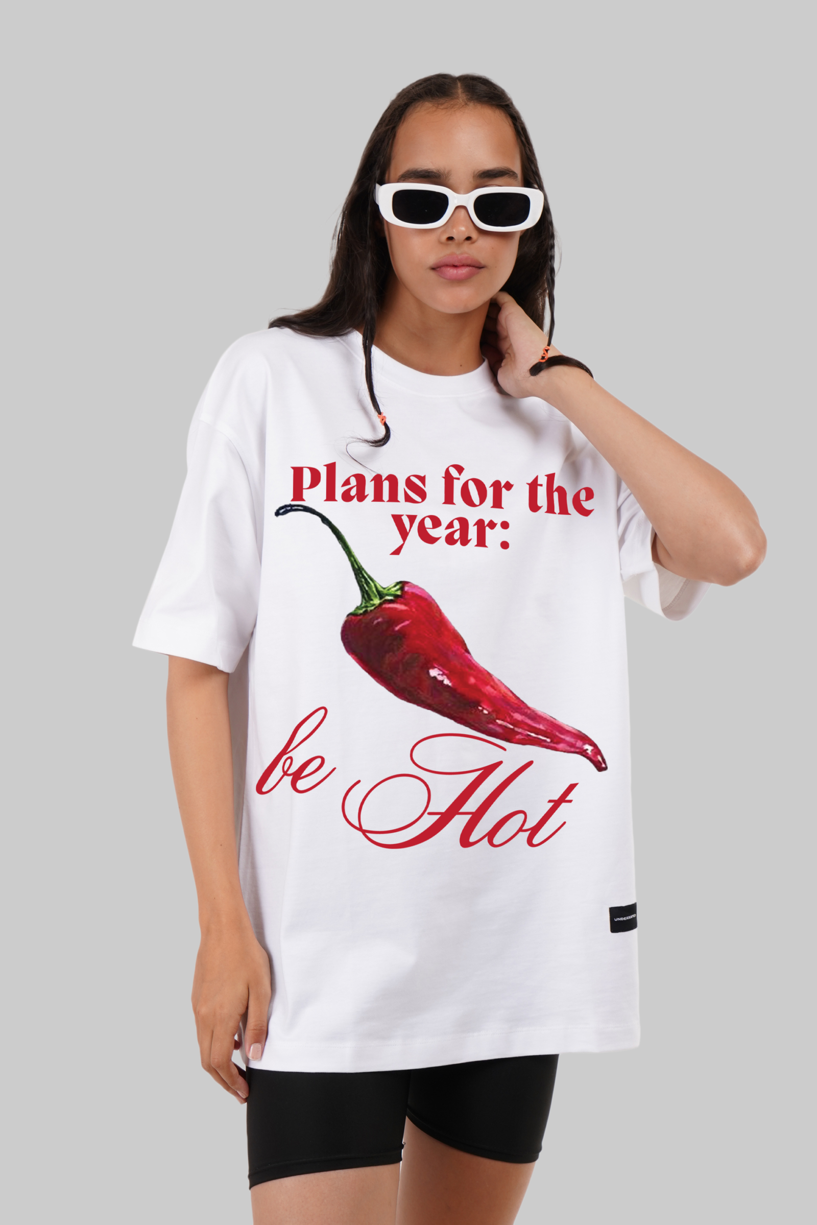 Serving heat, but keeping it chill. This oversized white women?s t-shirt comes with a fiery graphic twist bold chillis on the front and the cheeky mantra: Plans for the Year: Be Hot. It?s witty, confident, and effortlessly cool, perfect for when you want your fit to do the talking. Made from soft, breathable cotton, it?s oversized for that relaxed yet striking streetwear look. Styling Tip: Tuck into a mini skirt, add hoops and bold lipstick to match the chilli energy.