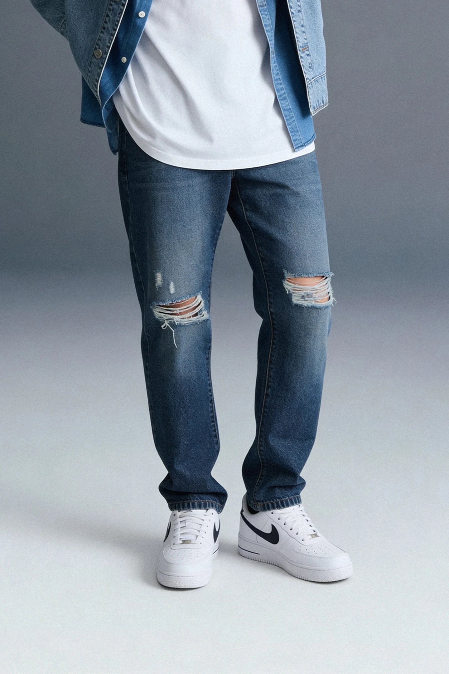 Dark Blue Mid Rise Distressed Men’s Relaxed Jeans