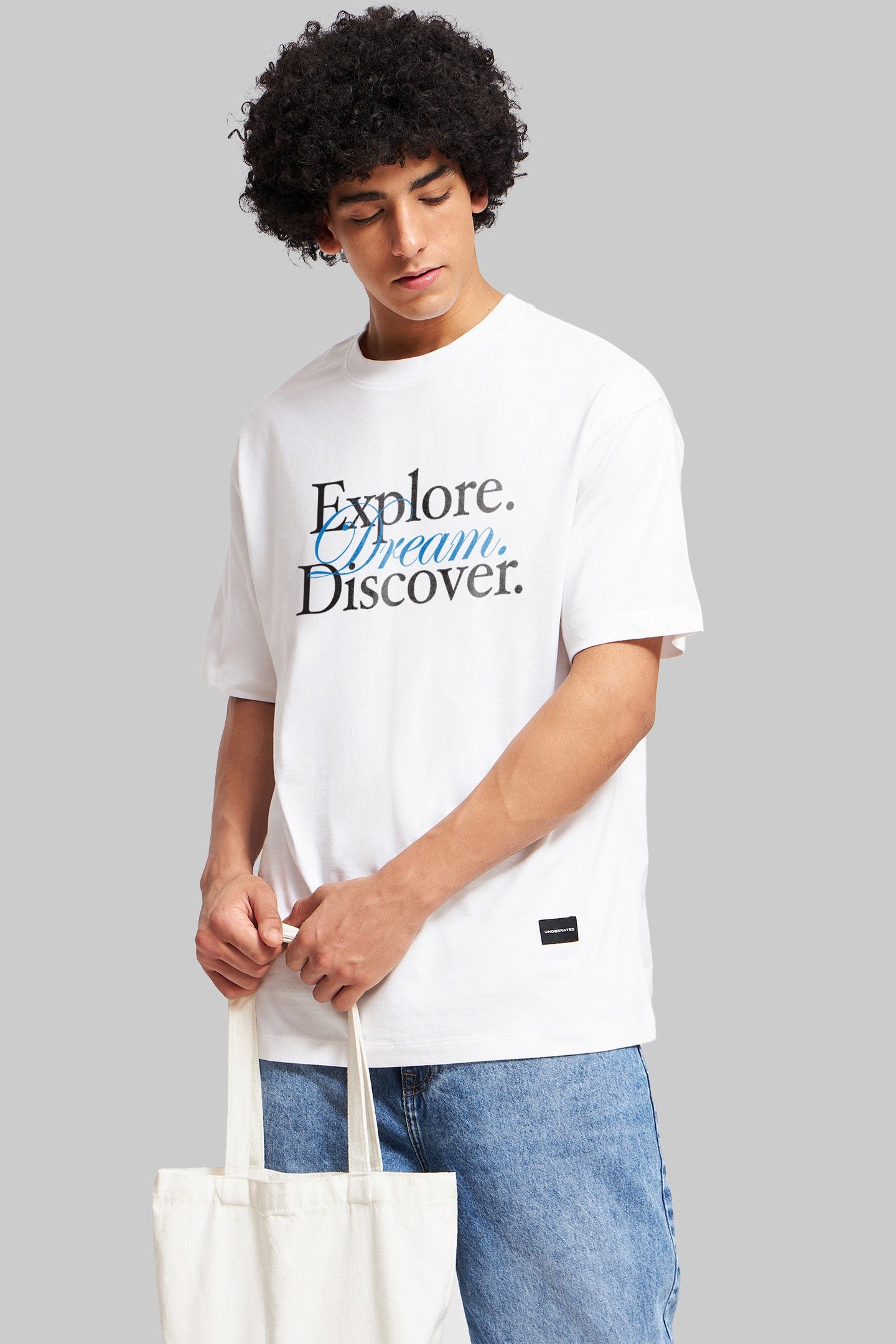 When did you last let your curiosity take over? This oversized white t-shirt for men not only dresses you, but also challenges you, as it was made for the traveler who has a touch of wanderlust. It sets the tone for days that don’t follow the rules with a striking, serif-led design that spells out your unspoken mantra – Explore. Dream. Discover. It’s made in our characteristic oversized fit and hangs loosely over the shoulders, with the ideal drape to maintain a laid-back atmosphere without being sluggish. The cotton construction? Just like your go-to weekend schedule, which starts with a backpack and ends in a remote location, it’s soft, breathable & trustworthy. This large white t-shirt is made to complement your mindset – open, daring & unapologetically brave – whether you’re enjoying brunch in the city or riding your bike through the unfamiliar. Wear it if the vibe is consistently on point but the route is unknown.