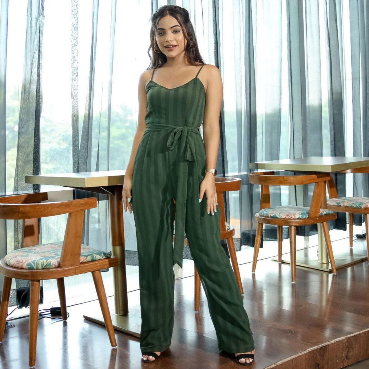 Featuring Green Chiffon Stripe Jumpsuit Fabric – Chiffon Model Wearing XS Gentle Wash only