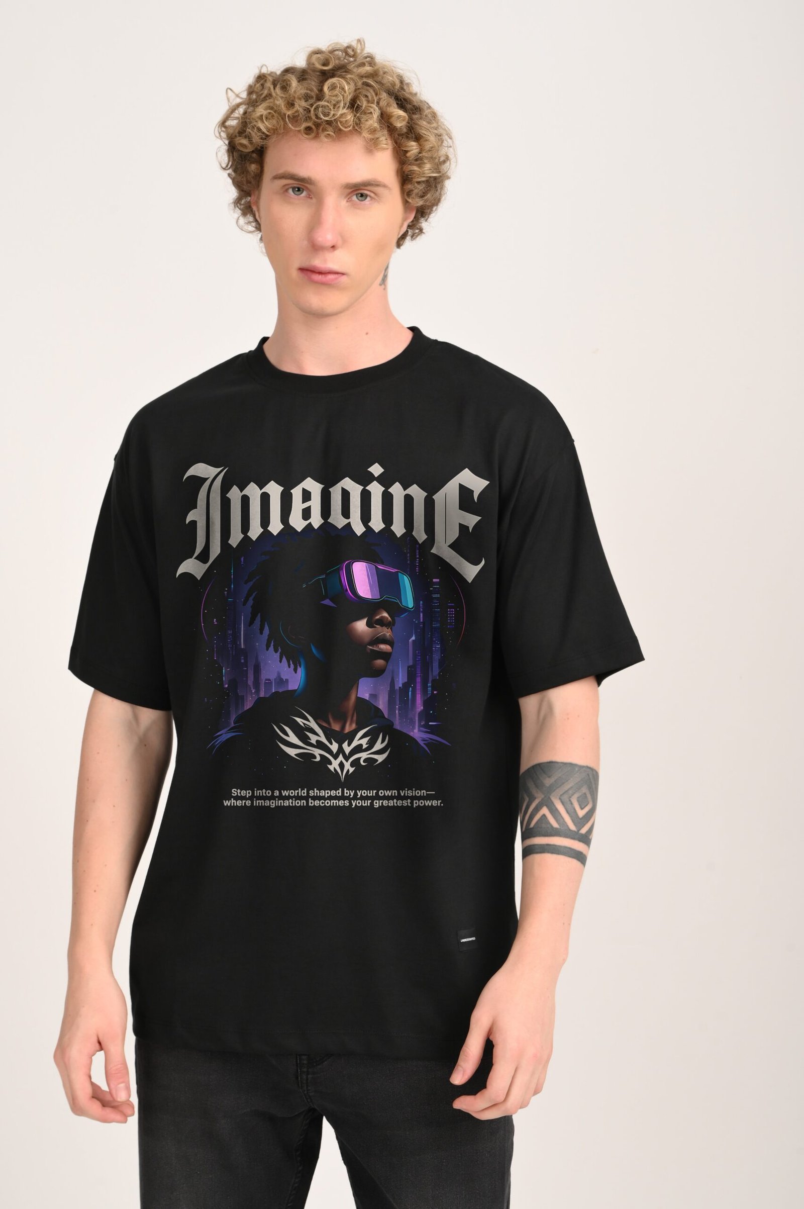 What if the cityscape in your mind could become the reality around you? That?s what this oversized black t-shirt dares to ask. With a surreal front graphic of a futuristic figure in glitchy VR shades, it captures the essence of limitless imagination. The word IMAGINE stamped across the chest in gothic silver ink? That?s your manifesto. Made from ultra-soft cotton, this oversized t-shirt men trust for both comfort and drip features dropped shoulders and a relaxed silhouette. It?s breathable, bold & built to last through every idea you bring to life. Wear it with black cargos and reflective shades. Or throw on a bomber to go full cyberpunk. You’re not just dreaming – you?re shaping the next dimension.