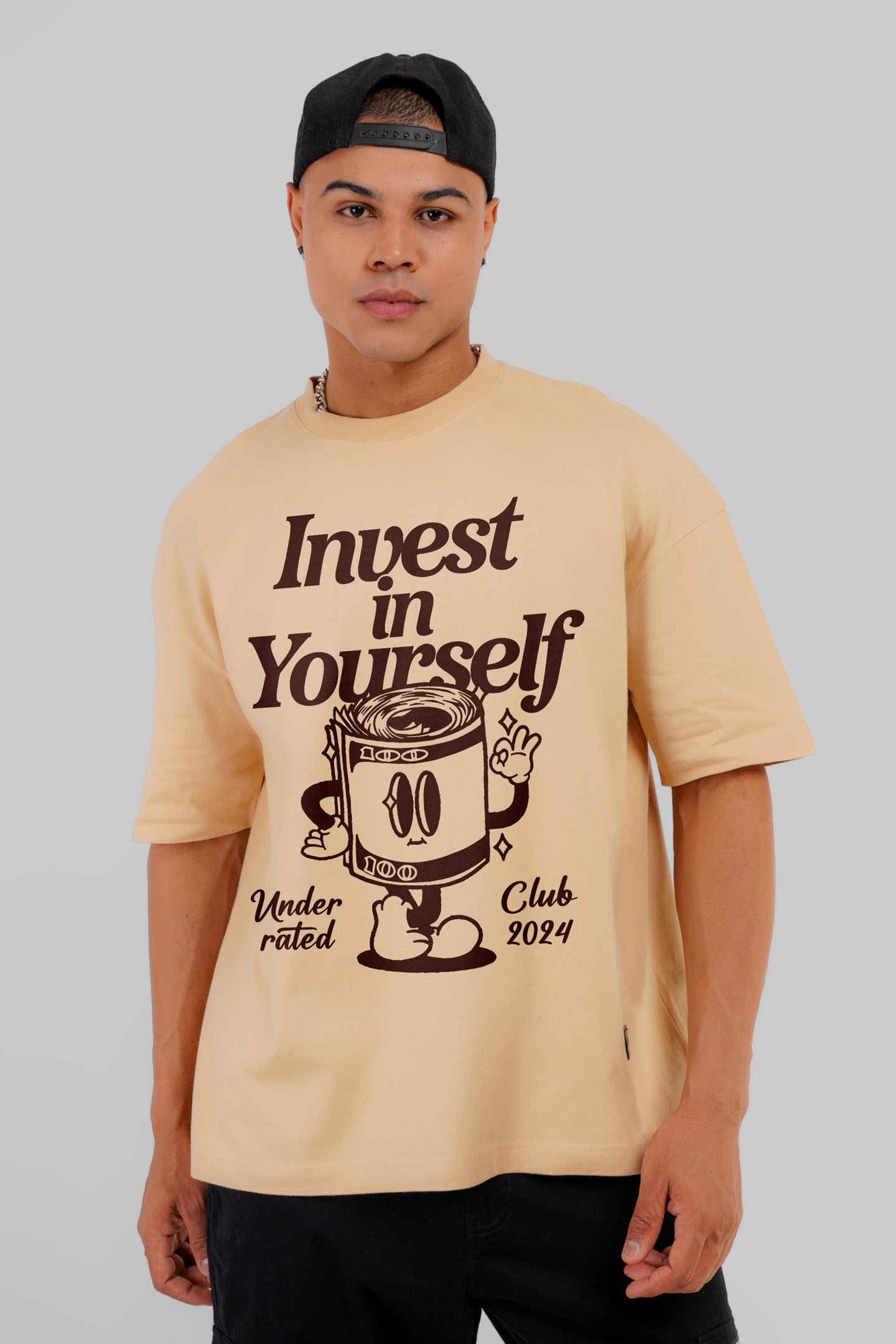 Feel like a boss in our Baggy Fit Men’s Graphic Print T-Shirt! Made from 100% cotton and in the the bold ?Invest In Yourself? typography print on the front is your daily reminder to stay awesome. With a crewneck and half sleeves, this beige t-shirt is ready to rock your casual wardrobe. The loose fit ensures maximum comfort, perfect for lazy weekends or casual outings. Join the club, wear the mantra, and keep investing in yourself because you deserve nothing but the best.