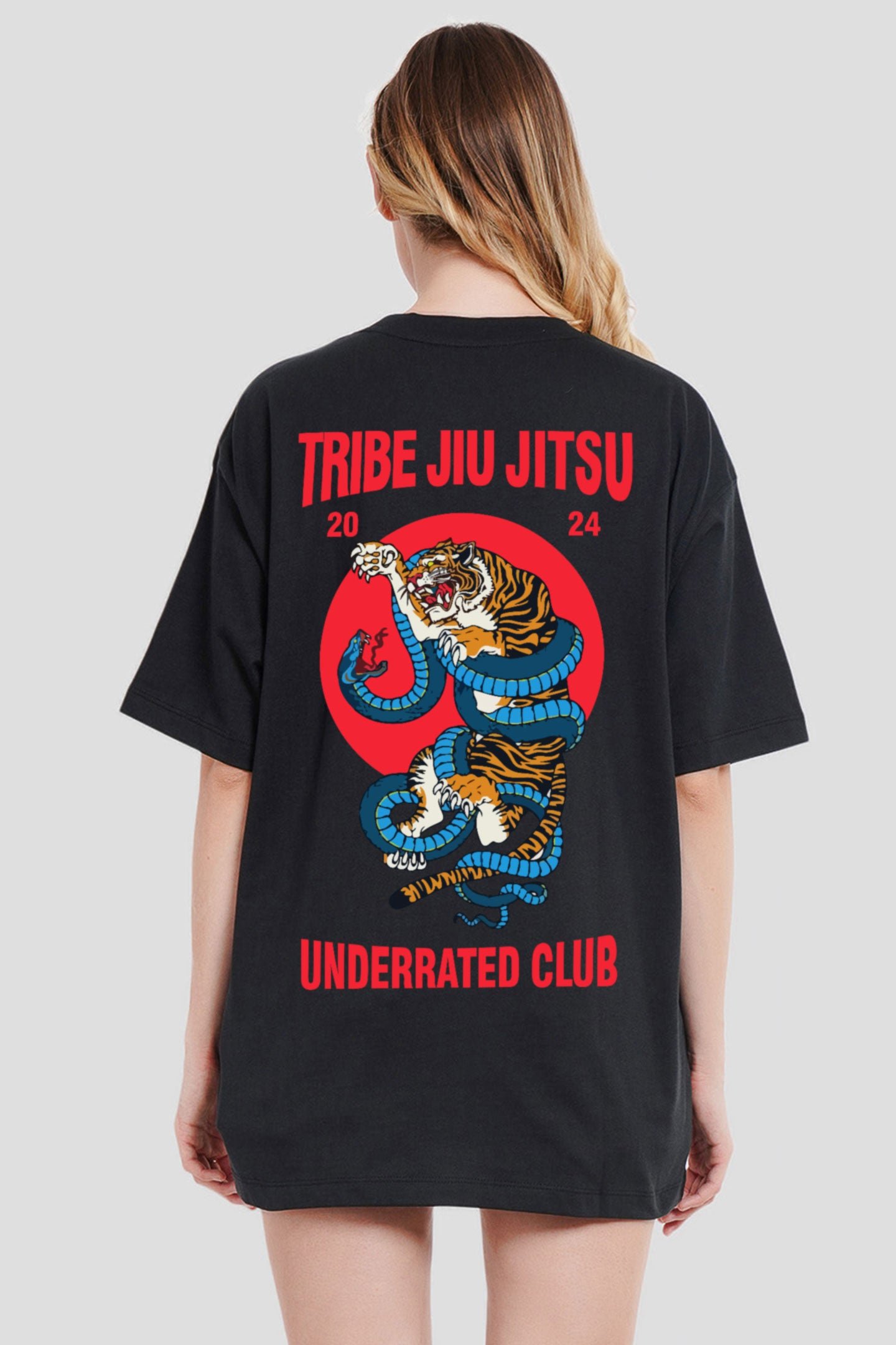 This Oversized Fit Women’s Graphic Print T-Shirt is your new best friend. This tee, made from 100% cotton and the classic crewneck and half sleeves provide a timeless look, while the pristine black fabric makes the graphic design truly pop. The Oversized Fit isn’t just about roominess?it’s about making a bold fashion statement. The back features a dynamic and powerful graphic of a tiger locked in an epic battle with a snake, accompanied by the text “TRIBE JIU JITSU 2024.” The bold red and blue colors highlight your passion and fearless attitude. Below, adds an air of mystery and exclusivity, signaling that you’re part of an elite group. Whether you?re mastering your jiu jitsu skills, hanging out with friends, or simply enjoying a lazy day, this black tee ensures you do it with style and flair.