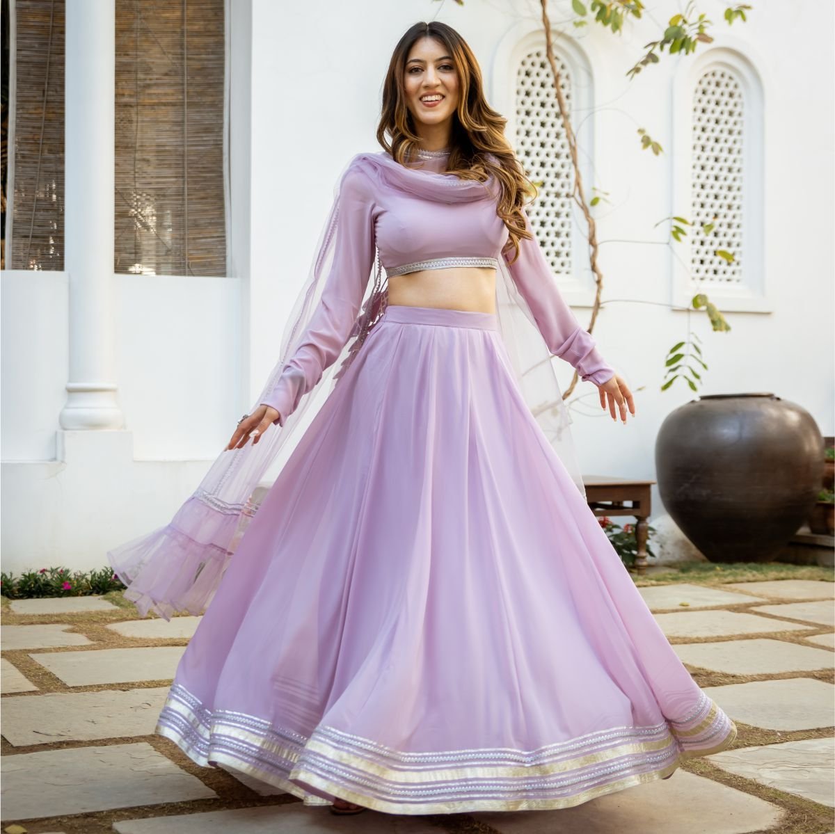 Elegance meets tradition in our Lavender Gota Lehenga Choli Set. Adorned with intricate gota work, this enchanting ensemble is a harmonious blend of modern grace and ethnic charm. The soothing lavender hue adds a touch of serenity, making it the perfect choice for any special occasion. Embrace timeless beauty with this exquisite lehenga choli set, where every detail reflects the essence of grace and sophistication.
