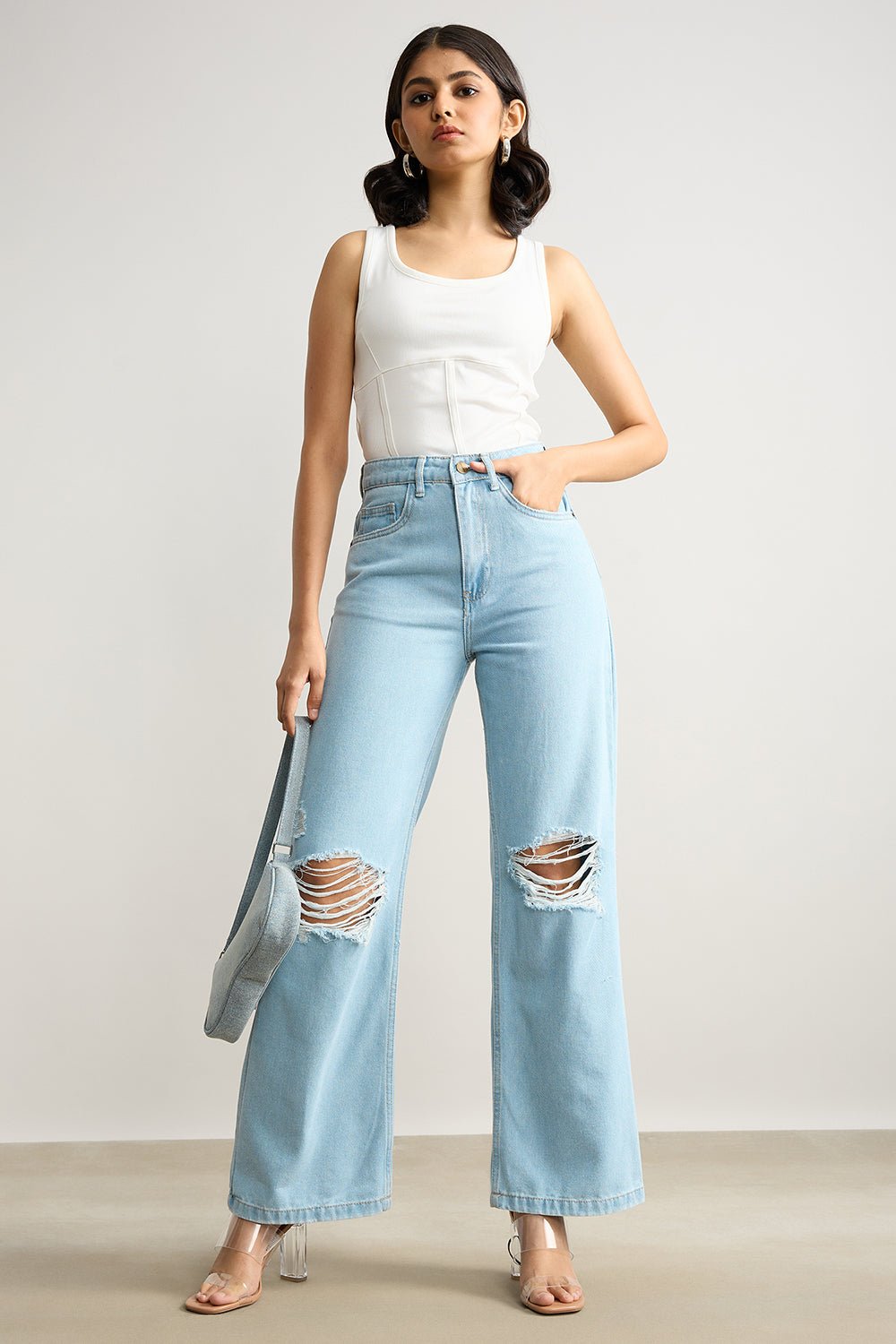 Fabric specification: 100% Cotton | RigidFit specification: High Waist | Wide leg | Regular lengthDescription: Add an edge to your look with these High Waisted Distressed Light Blue jeans. Featuring diagonal pockets and metal button fastening, this trendy regular length pair is designed to sit high at the waist and features distressed details at the knee for a flattering look.