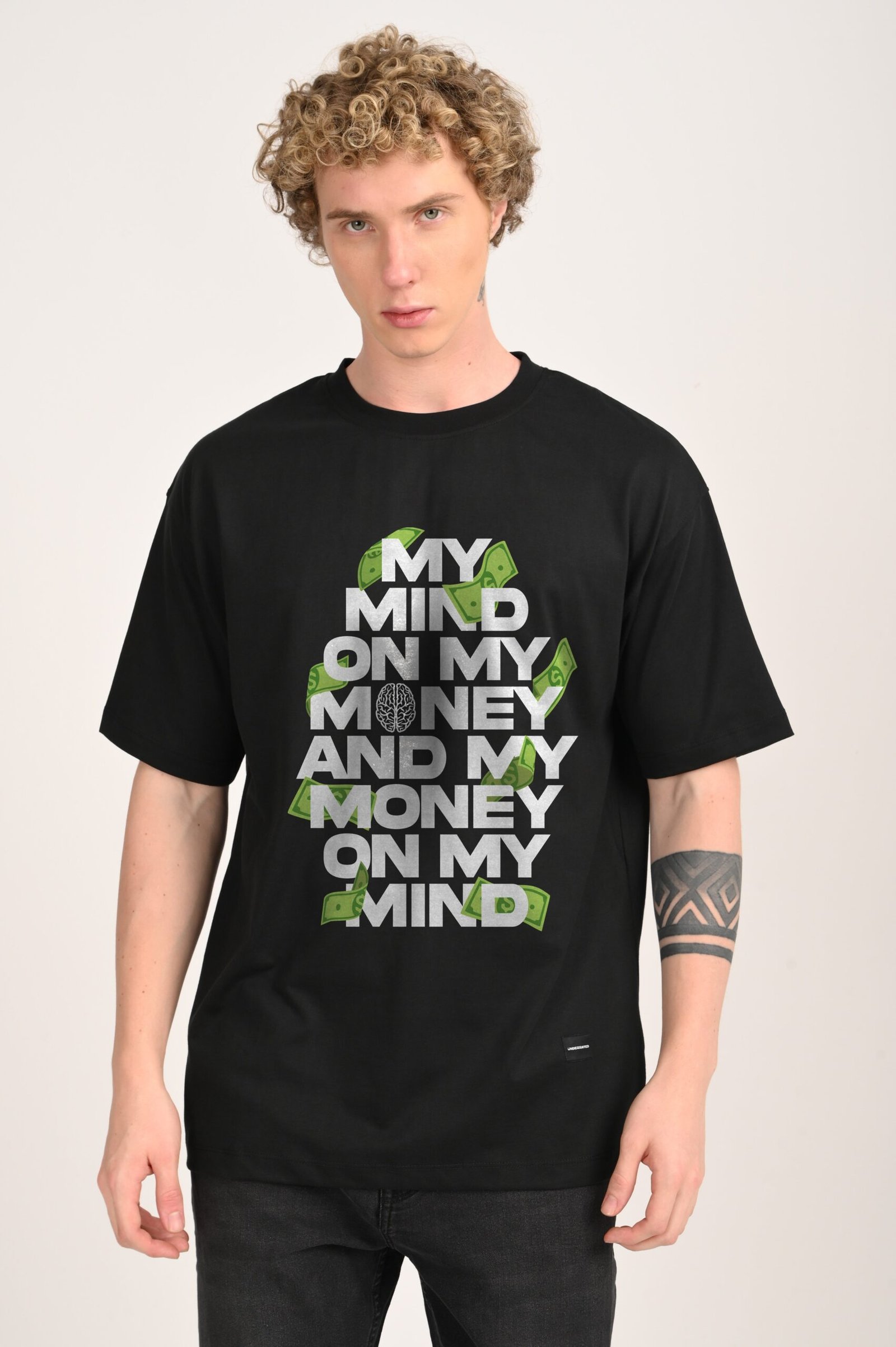 All about the grind. This oversized black graphic t-shirt blasts My Mind On My Money, And My Money On My Mind across the front, with tiny green dollar notes scattered everywhere like a money rain bold, cheeky, and straight-up street energy. Heavyweight cotton with dropped shoulders and a relaxed oversized fit keeps comfort on point while the graphic steals the show. Style Tip: throw it over black joggers with a longline hoodie and high-top sneakers for a flexed-up urban look.