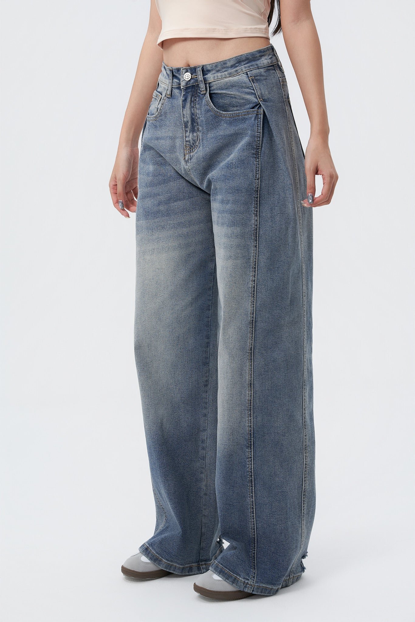 Style: Wide Leg JeansWash: Light faded washDetails: Extended pleat-style side panels, wide silhouette, belt loops, zip fly & button closure