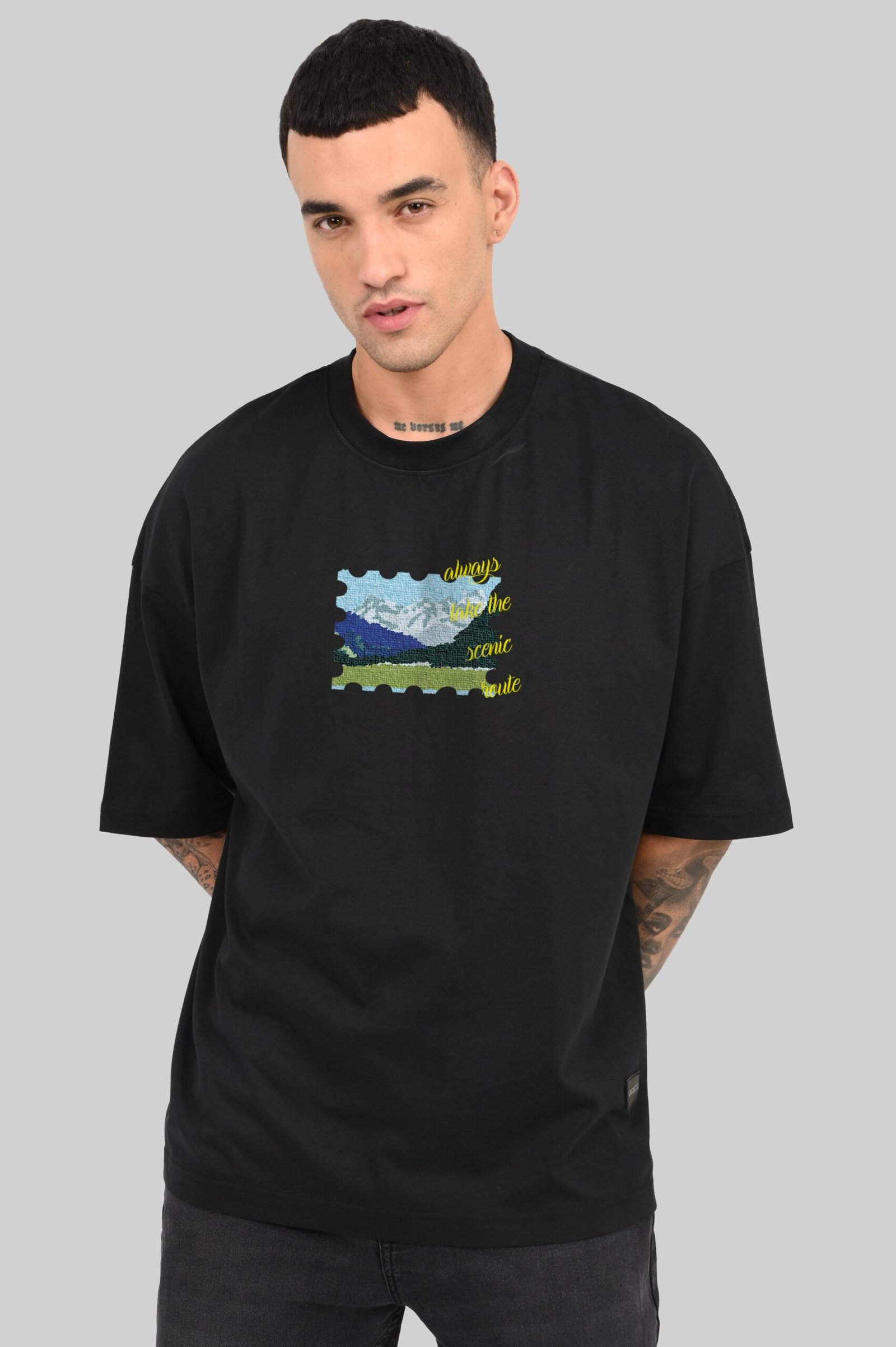 Isn’t the tale always improved by taking the lengthy path? With a pixel-style travel postcard and the reminder to “always take the scenic route,” this t-shirt is more than a graphic; it’s a way of life. One for the folks who avoid shortcuts, go off course into the unknown & never look for return dates. This black baggy t-shirt has wide sleeves and dropped shoulders, cut in our characteristic baggy men’s fit, and hangs perfectly to give off that on-vibe, off-duty vibe. Made of breathable, gentle cotton, allowing you to explore a lot and yet remain calm. Pair it with faded cargos, worn-in sneakers & a desire to vanish for a while.