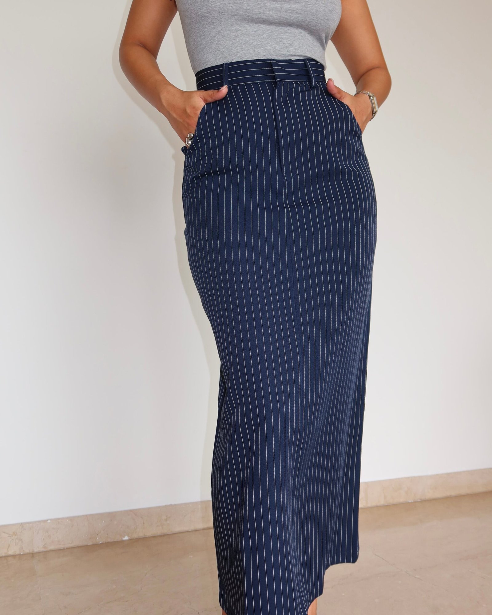 ?Product Details?? Fit: Slim fit through waist and hips, straight silhouette?? Details: Full-length pinstripe skirt with subtle stretch and clean waistband?? Fabric Weight: 220 GSM?? Elasticity: Stretch?? Composition: 95% Polyester, 5% Spandex?? Feel: Structured with a flexible feel?? Styling Tip: Pair with a tucked-in top and platform shoes for a modern take on workwear classics