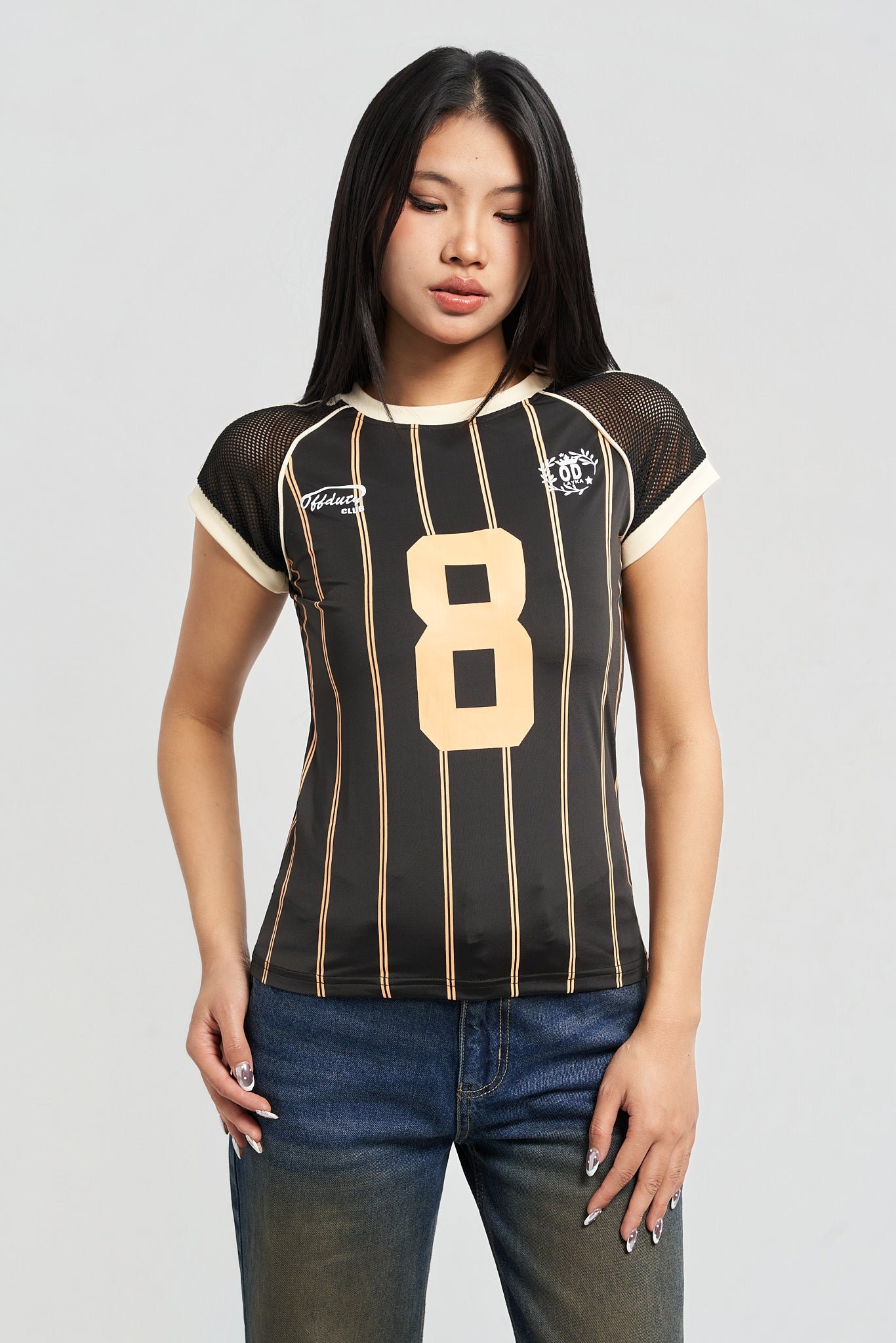 A sporty-meets-streetwear essential, this top features a bold 8 graphic across the front, giving it a standout athletic vibe. The mesh sleeves add a breathable, dynamic edge, while the fitted body keeps the silhouette sleek and flattering. Perfect for pairing with joggers, cargos, or denim for an effortlessly active look.