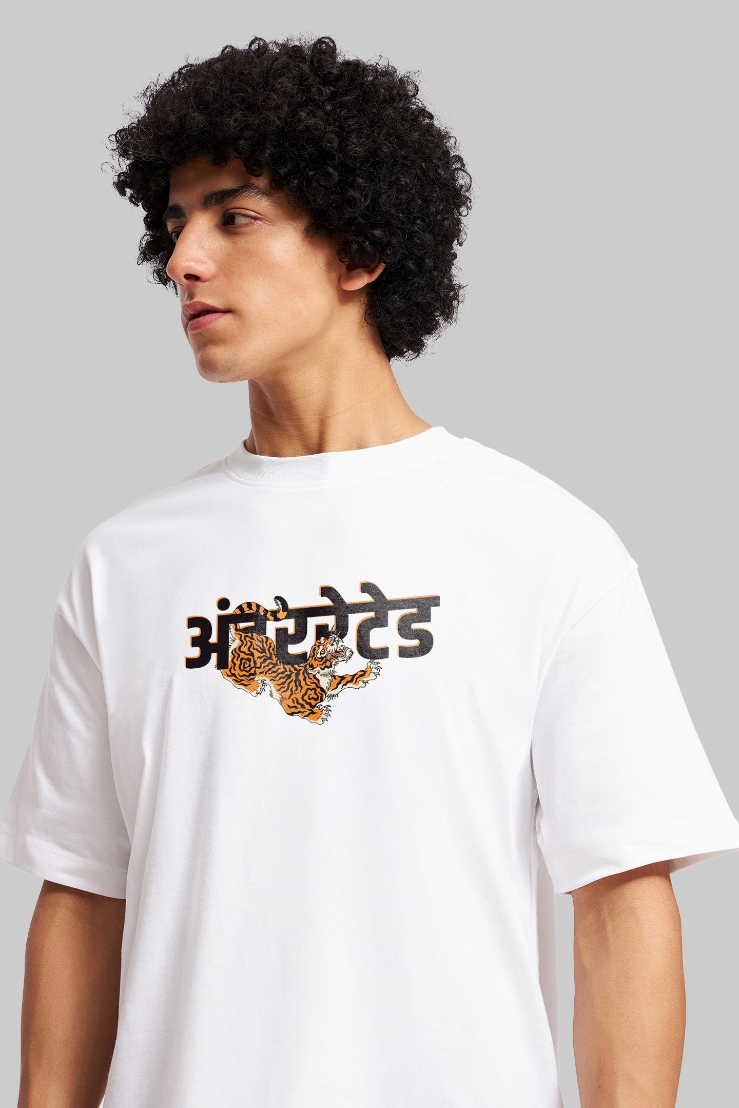 Why conform when you were born to stand out? The Tigerrated oversized white t-shirt for men embodies boldness and strong roots. With a striking tiger bursting through Devanagari script, the design exudes vibrant energy and local pride. Its placement is simple, but the attitude is anything but. Crafted from high-quality, ultra-soft cotton, this oversized white t-shirt offers exceptional comfort with a relaxed fit and flowing drape. The drop shoulders create a laid-back streetwear look that makes a statement, even without words. Pair it with loose jeans, cargo pants, or wear it beneath a shirt jacket. No matter how you style it, this shirt is designed for those who act on instinct rather than follow rules. Understated in name, wild by nature.