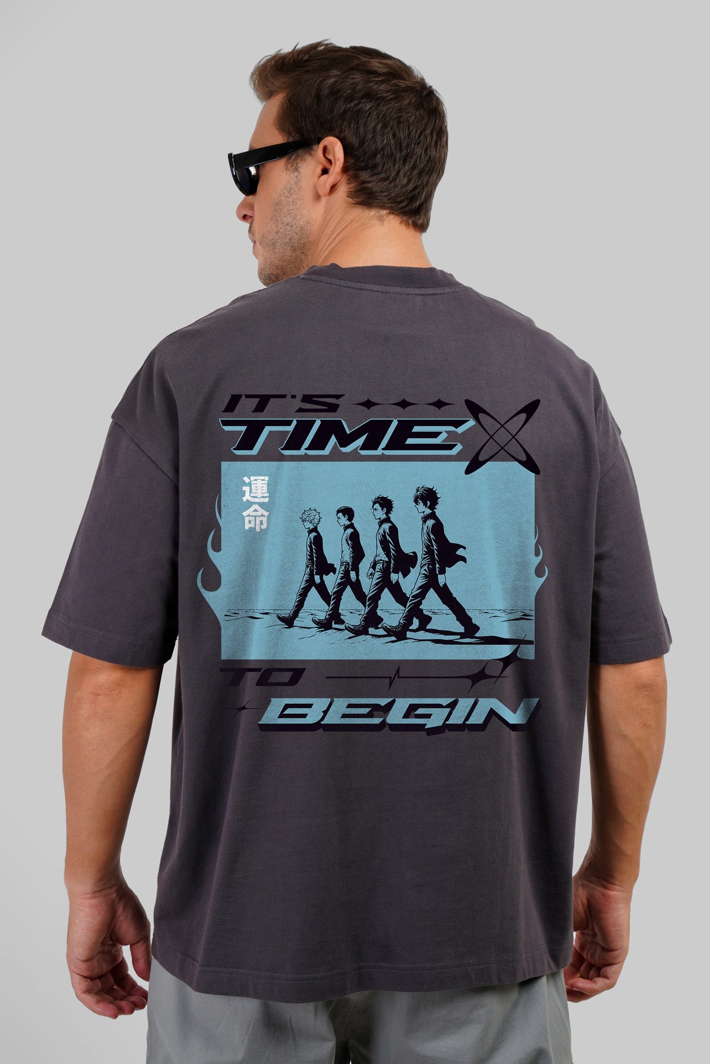 Ready to level up your streetwear game? The Time To Begin Dark Grey Baggy Fit T-Shirt has you covered. Featuring four anime characters on the move with the bold text, ?It?s time to begin,? this tee radiates that fresh-start energy. The blue graphic on the back pops against the dark grey fabric, giving off major cool vibes. With a relaxed baggy fit, dropped shoulders, and half sleeves, this 100% cotton tee is perfect for those chill, everyday adventures. Style this Anime Print T-Shirt with distressed jeans and white kicks to complete the look!