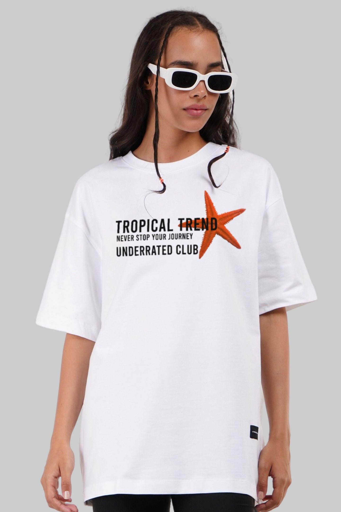 Forced to dive into a mountain of work when you?d rather dive into the cool, blue ocean? This oversized t-shirt for women is printed with a motivating message of never stopping your journey, and a cute orange starfish. Made from soft and pure cotton, this tee is kind to your skin and the environment as well. The relaxed shoulders and half sleeves offer freedom of movement to deal with any challenges in your path. Pair this white oversized t-shirt with some comfy pants of your choice, beachy slides, and get ready to lean into the tropical vibe!