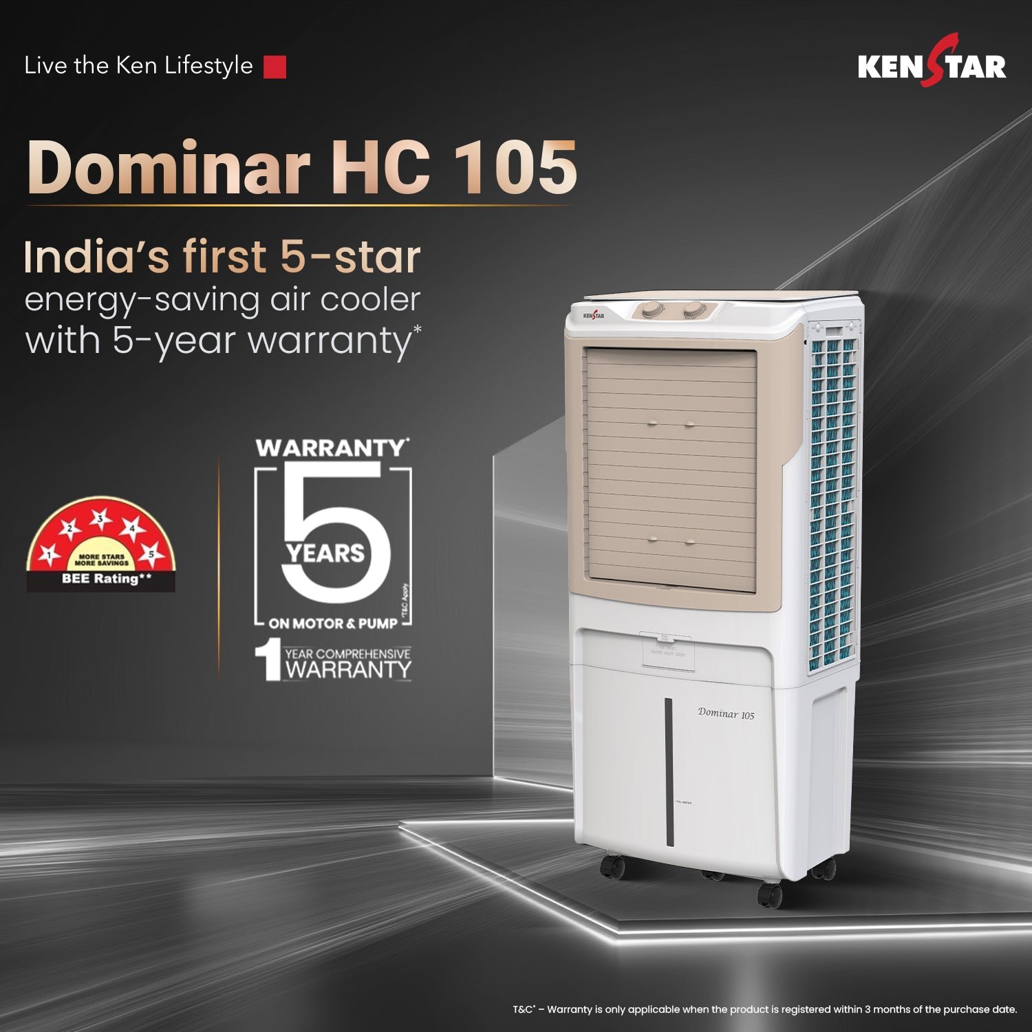 105 delivers powerful and efficient cooling for larger spaces. Hydro-dense cooling pads with Quadra Flow Technology provide an air throw of up to 50 ft (15.2 m). Consuming approximately 180 watts, it features a 16-inch powerful fan with 3-speed collapsible louvers for customized airflow. Inverter compatibility ensures uninterrupted cooling during power cuts (subject to inverter capacity). Added conveniences include a water level indicator and castor wheels. Backed by a 5-year warranty on motor & pump and a 1-year comprehensive warranty.