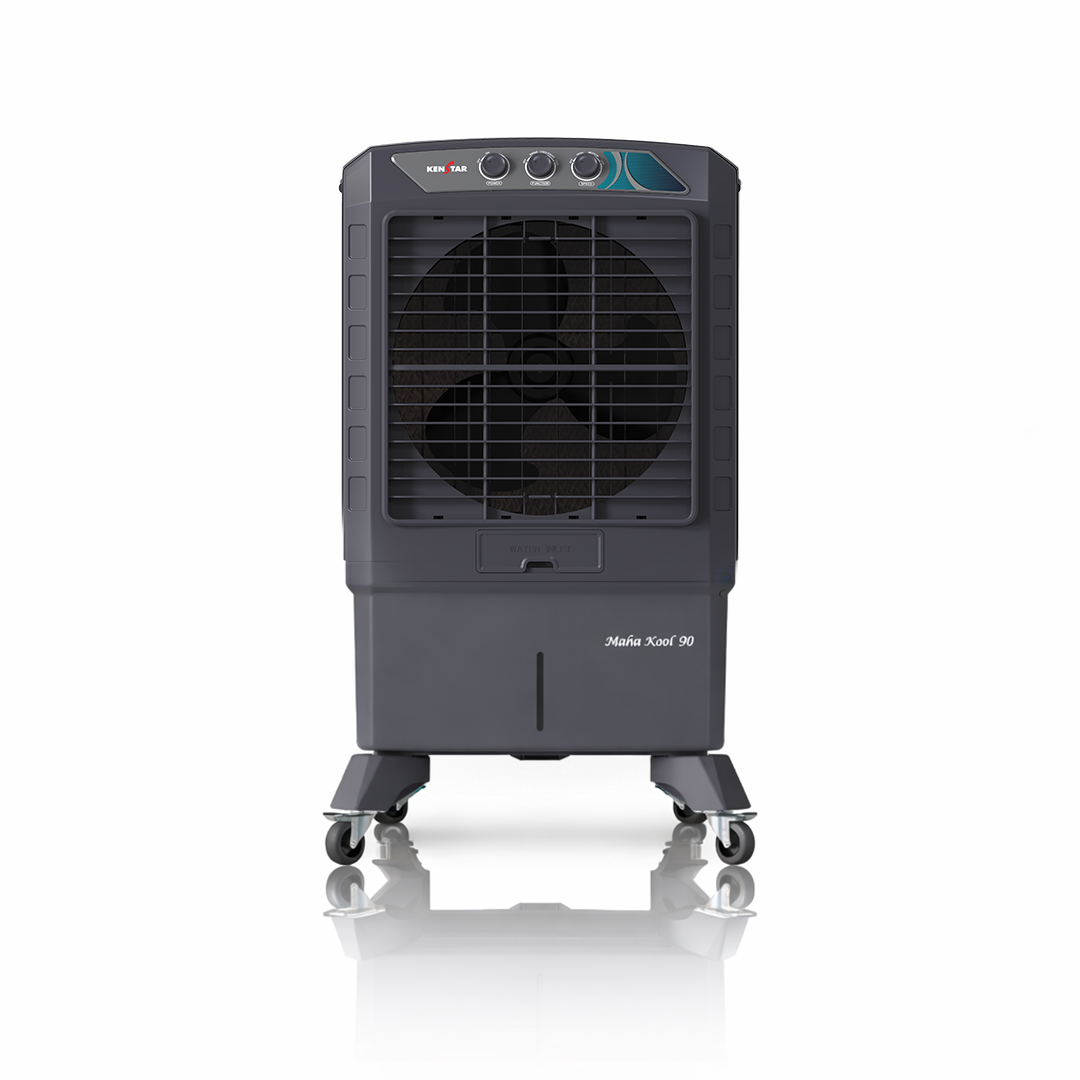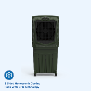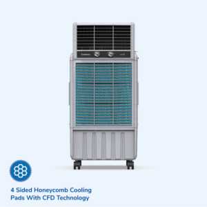 The cooler features three-side superior blue cooling pads that offer up to 30% more cooling and 50% greater water retention for long-lasting performance. It operates with a power consumption of approximately 230 watts, balancing efficiency with powerful cooling. A large 45.7 cm high-performance fan ensures strong airflow, making it suitable for larger spaces. Front-locking commercial-grade wheels provide enhanced stability and effortless movement. Designed for versatile use, the cooler is ideal for domestic, commercial, and industrial environments. Additionally, it comes with a 5-year warranty on the motor and pump, along with a 1-year comprehensive warranty for added peace of mind.