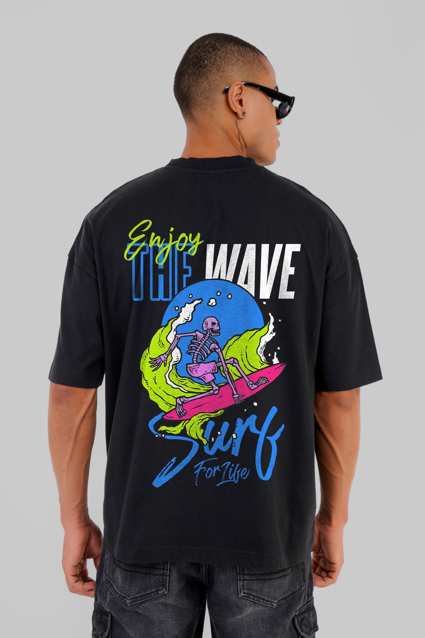 Alive or not, if surfing is your passion then no one can keep you away from the waves! This quirky baggy t-shirt for men has a dope back print which features a supercool skeleton enjoying the wild waves with their surfboard. The bold hues stand out against the black fabric and the visuals are funky and eye-catching. The relaxed fit and dropped shoulders allow great ease of movement and the soft fabric is perfect for everyday use. So grab your baggy black tee, pair it with some comfy shorts or jeans and get ready to hit the surf!